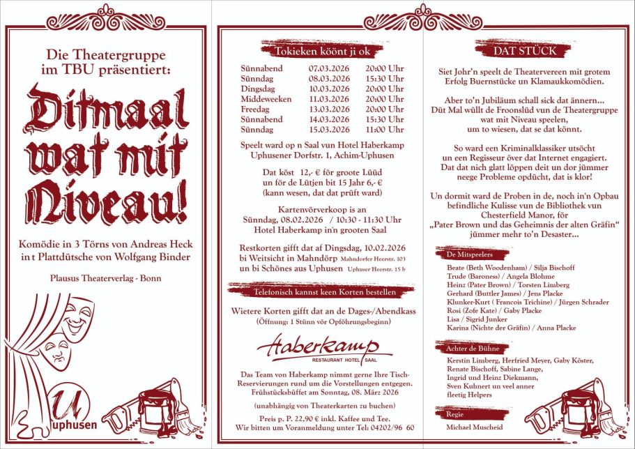 Mit viel Engagement und Liebe zum Detail bringt die Theatergruppe im TBU auch 2026 wieder ein plattdeutsches Bühnenhighlight auf die Bühne. „Ditmaal wat mit Niveau!“ verspricht beste Unterhaltung, lebendige Charaktere und eine humorvolle Krimikomödie in besonderem Ambiente.